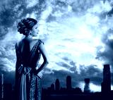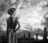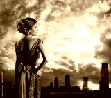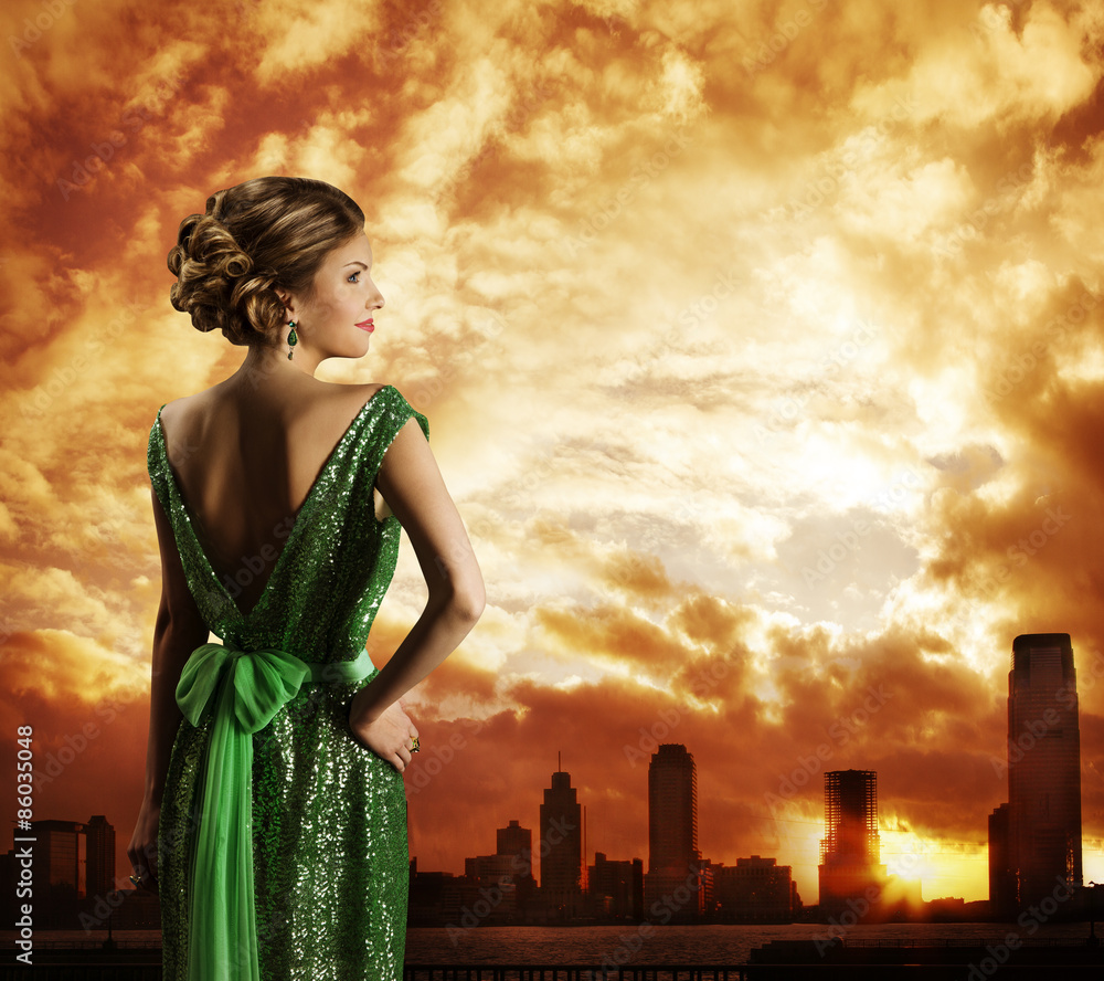 Woman in Green Dress, City Sky Sundown, Fashion Model Rear View