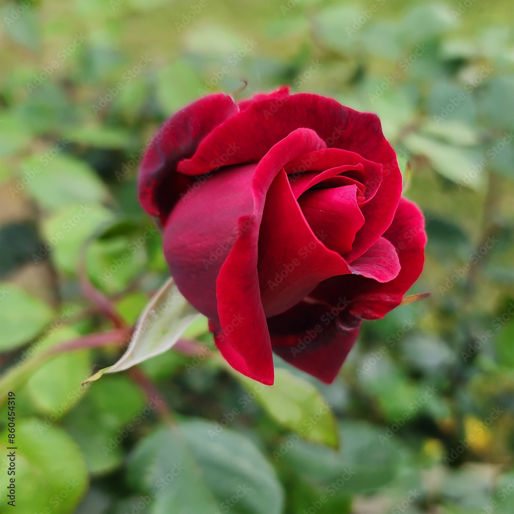 Beautiful velvet red rose in the garden. Flower on a background of green leaves. Can be used to create a postcard. Floral background.
