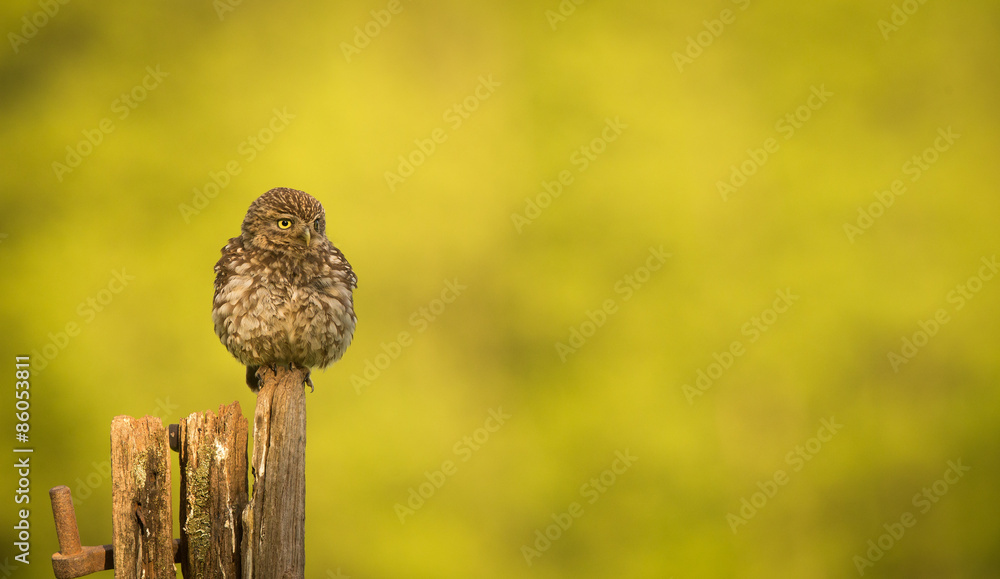 Little owl on an old post isolated against a yellow background
