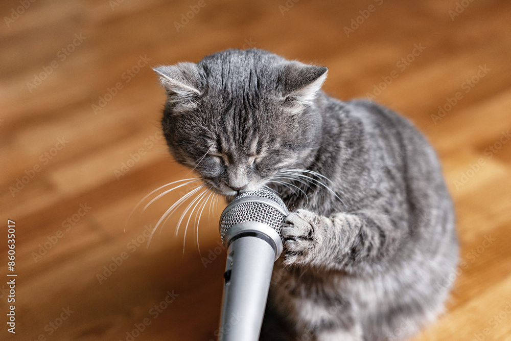 The cat sings into the microphone. A cat with a microphone. Funny animals. Funny cats.