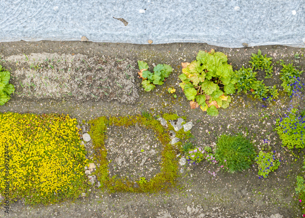 Top view of vegetable garden for self sufficient organic food production. Plants growing on earth.