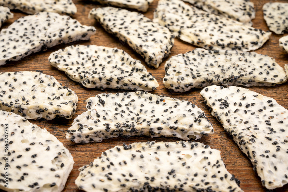 slices of dried white dragon fruit against rustic weathered wood