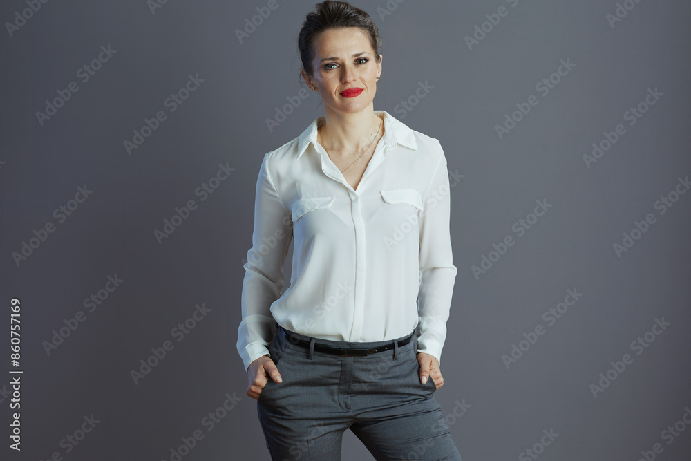 trendy business woman isolated on gray background