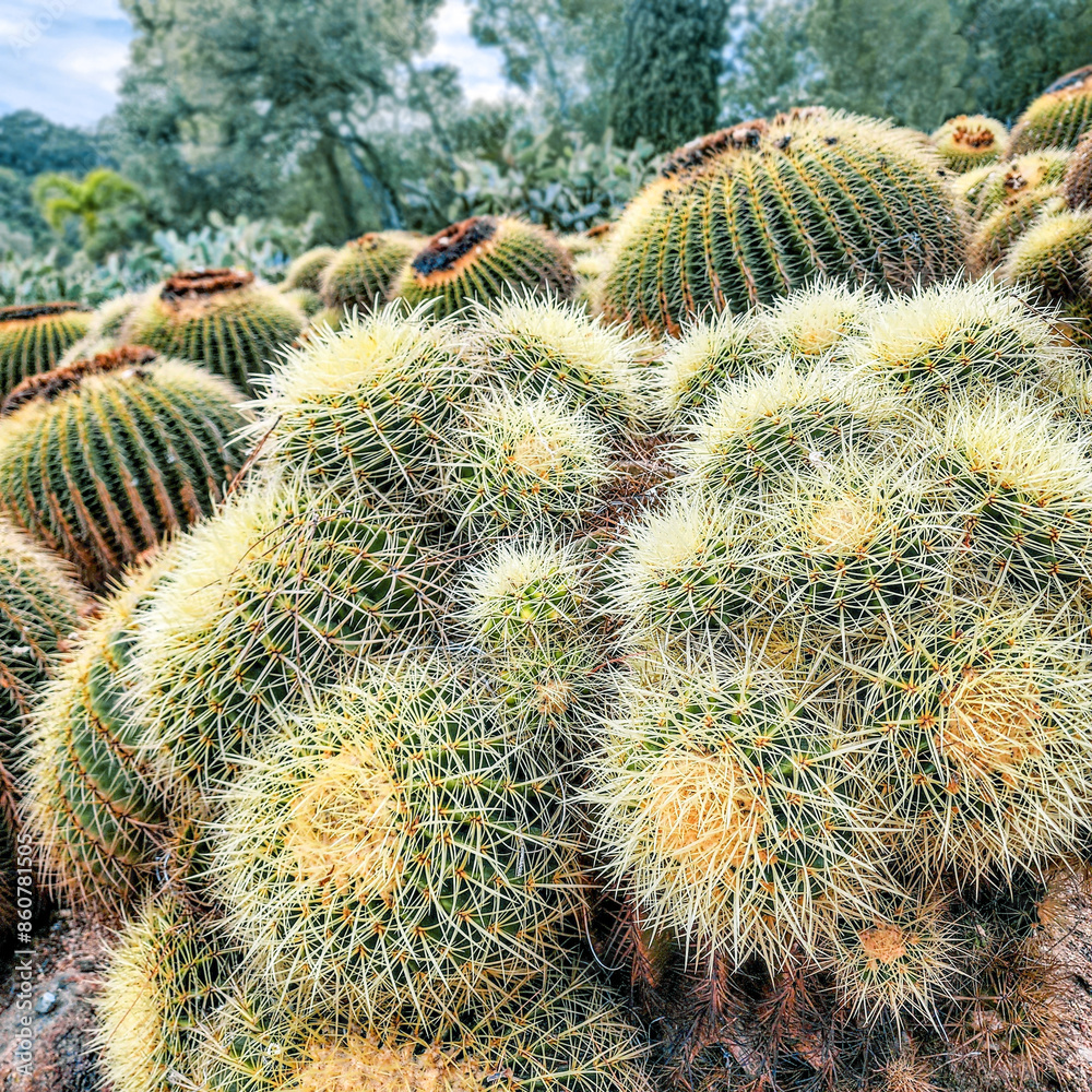 Rockery, desert garden with different types of cacti. Golden Barrel Cactus - Echinocactus grusonii. Jardin "Pinya de Rosa" Spain, Blanes.