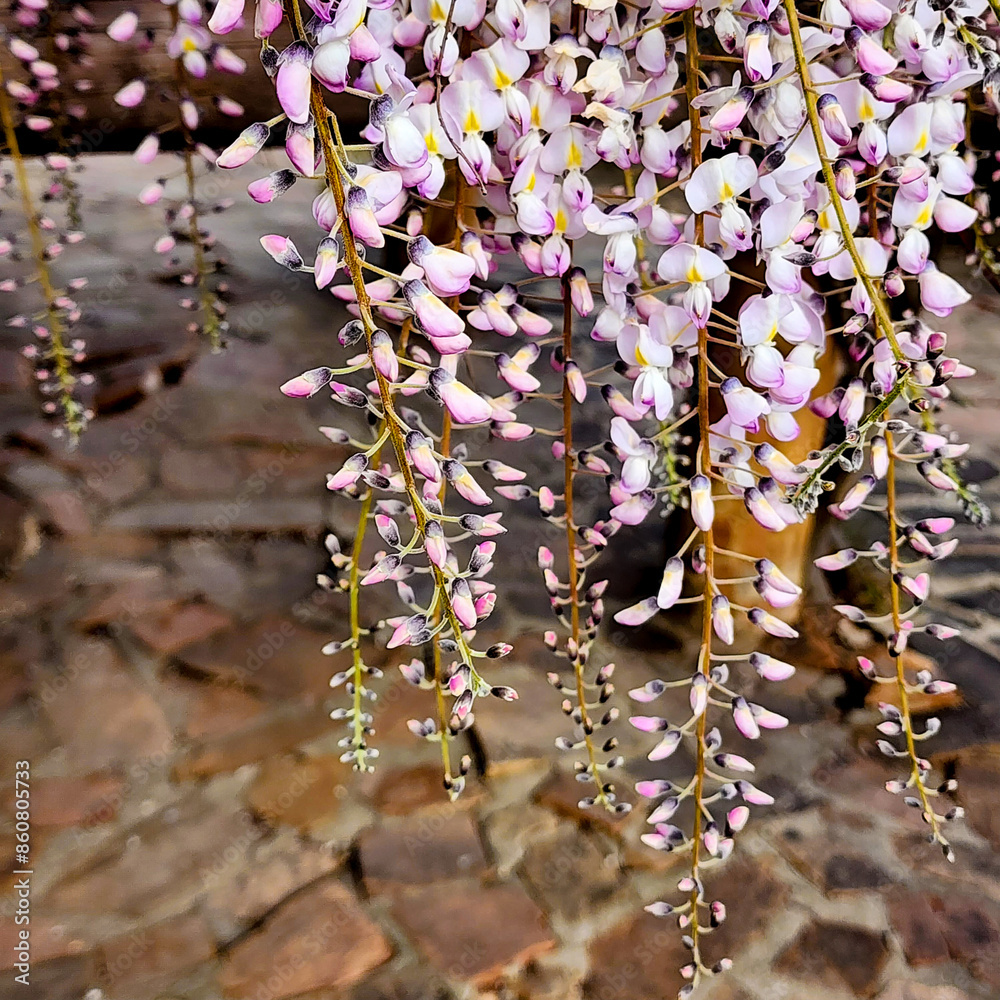 Beautiful white-pink wisteria. Sunny spring day. Floral nature background. Wallpaper.