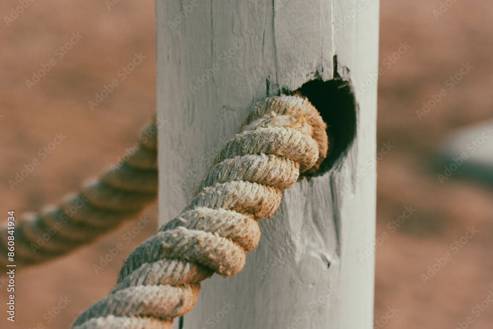 Organic cotton white rope on a white wooden fence, gate on a sandy beach. Post and ropes background. Nautical summertime theme.