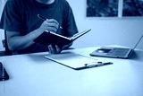 A householder manages household expenses while working at a desk, tracking various costs such as transportation, housing, groceries, dining, healthcare, utilities, and personal items to maintain
