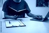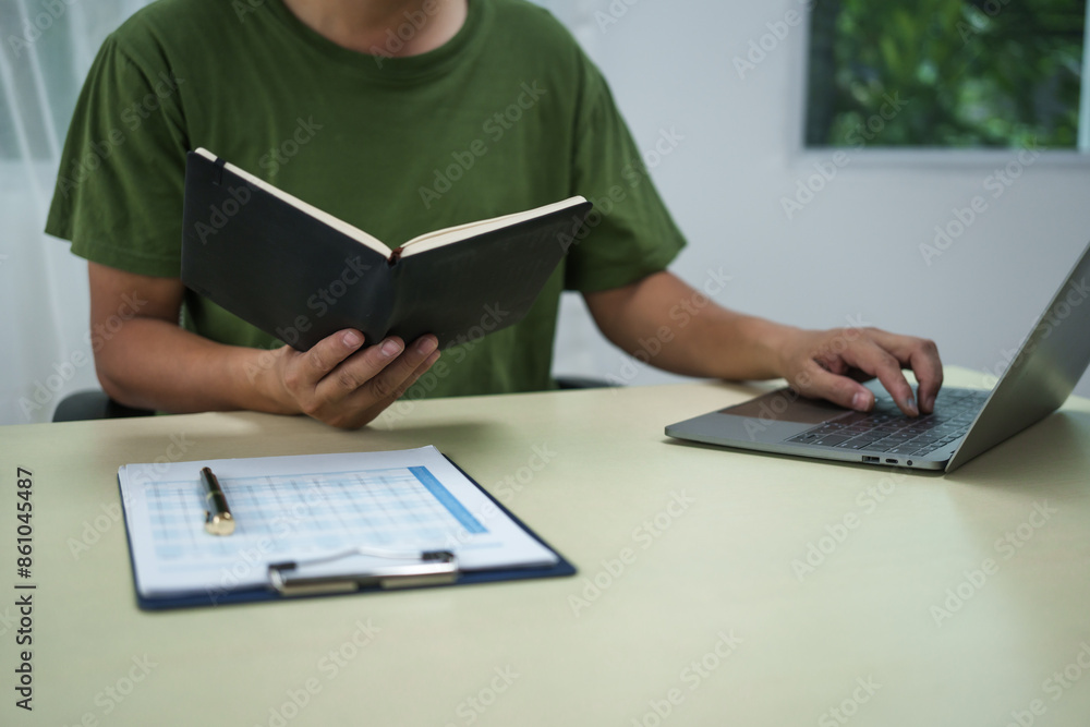 A householder manages household expenses while working at a desk, tracking various costs such as transportation, housing, groceries, dining, healthcare, utilities, and personal items to maintain