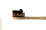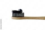 Charcoal toothpaste on bamboo toothbrush isolated on transparent background. Swatch of black charcoal whitening toothpaste on brush for design.