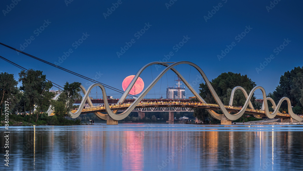 Pink strawberry Full Moon rises behind of the pedestrian bridge in Obolon district, Kyiv, Ukraine