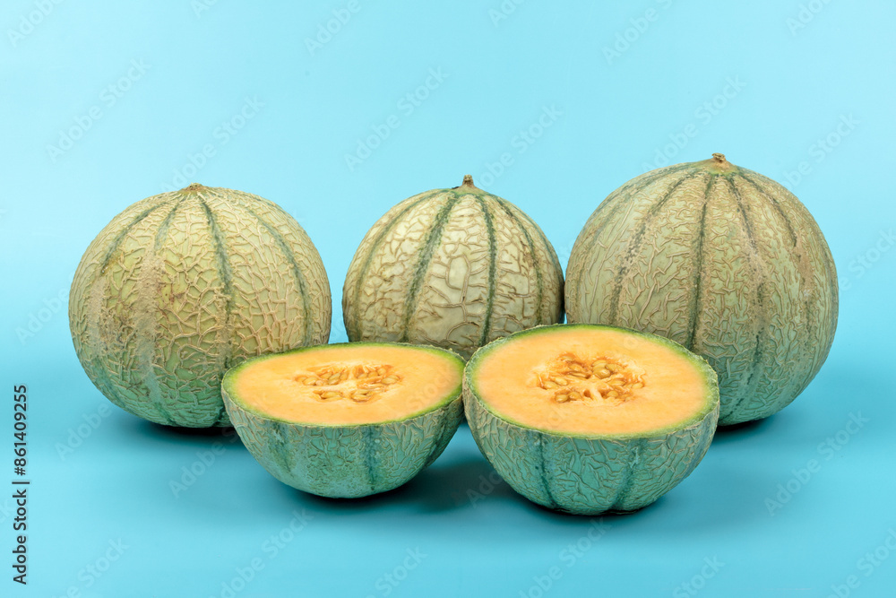 melons en gros plan, sur un fond bleu