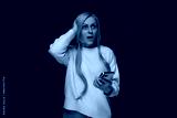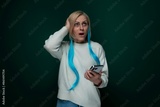 Woman With Blue Hair Holding a Cell Phone