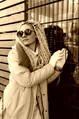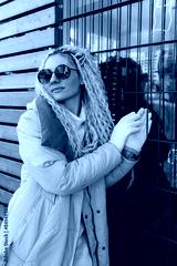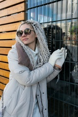 Woman in White Coat and Sunglasses Leaning Against Wall