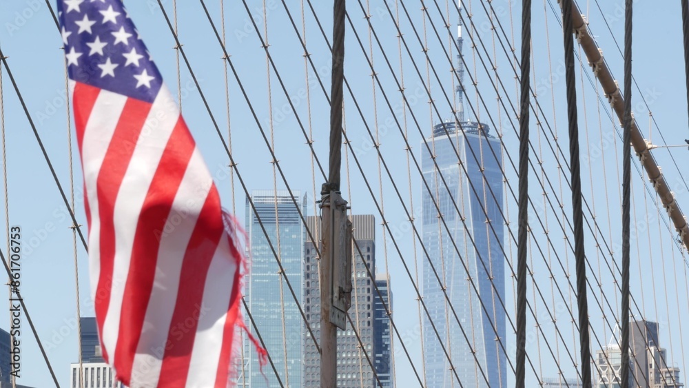 Flag on Brooklyn Bridge, Manhattan downtown, New York City skyline, financial district cityscape. World Trade Center skyscraper. United States of America patriotic symbol of independence. Bridge cable
