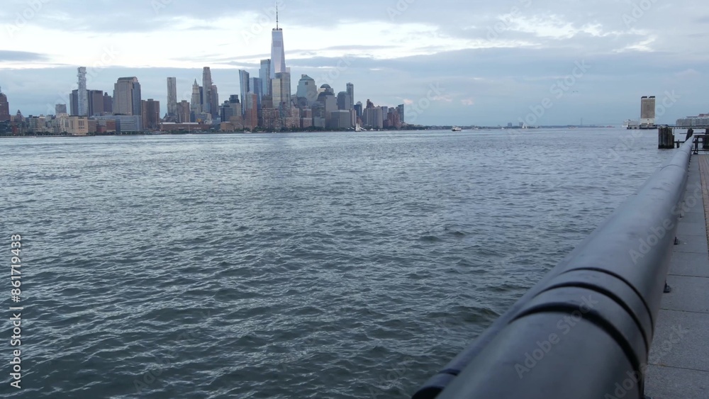 New York City waterfront skyline, Manhattan Downtown Financial district, World Trade Center building, riverfront skyscrapers. From Pier A, Hoboken, New Jersey. United States architecture. Hudson river