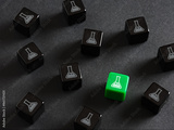 Green cube standing out from the crowd of black cubes with chemistry beaker symbol.