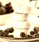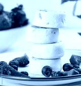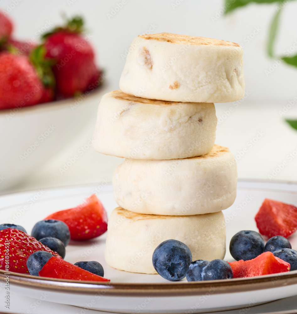 A stack of four cheesecakes on a plate with berries, blueberries, strawberries and cherries.