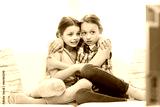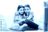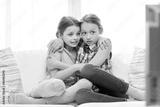 scared little girls watching horror on tv at home