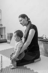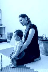 Physiotherapist assisting young injury child with coordination exercise in rehabilitation center. Neurological rehabilitation for child with therapeutic physiotherapy