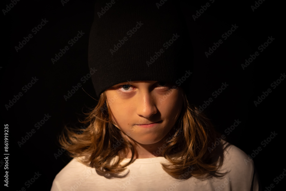 A teenager in a black cap with long blond hair, dark background. He looks directly into the camera, sullen, serious look.