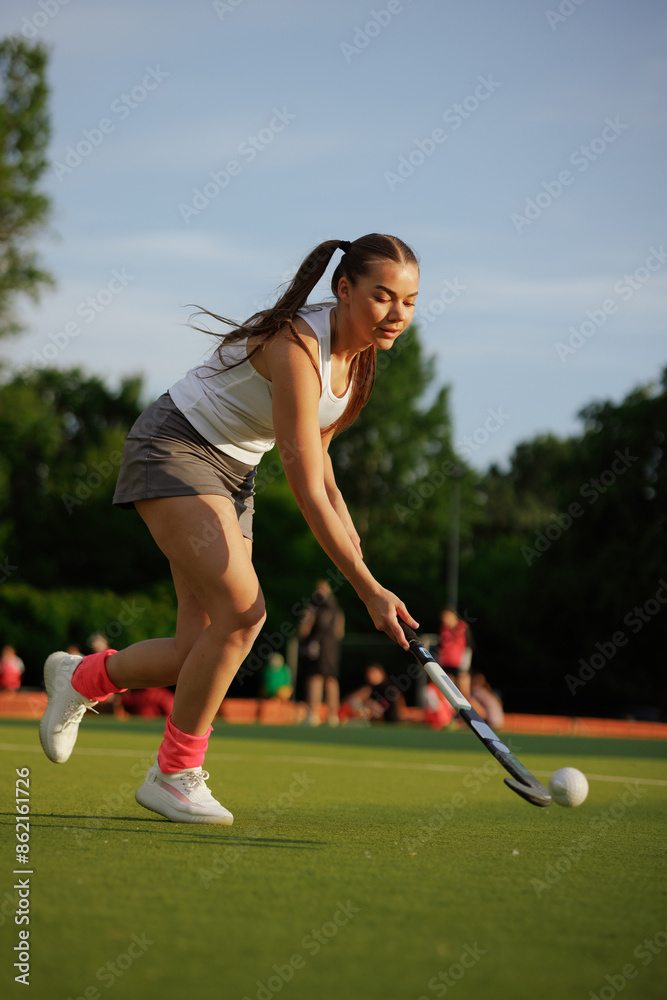 girl hockey player plays field hockey on a sunny day, the hockey player hits the ball with a stick