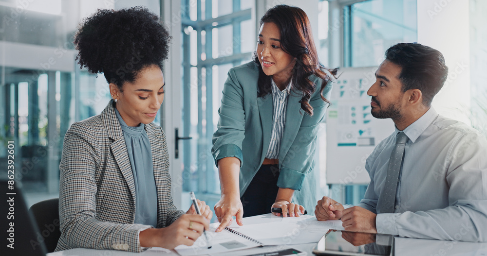 Business people, paperwork and planning in office meeting, collaboration and teamwork for proposal. Employees, talking and documents for finance review, support and briefing in boardroom for project