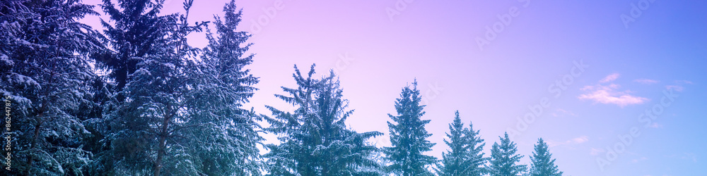Snow-covered spruce trees against the backdrop of the sunset sky. Horizontal banner
