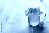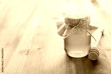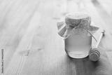 Natural honey in a pot or jar with twine tied in a bow and honey dipper on a wooden background