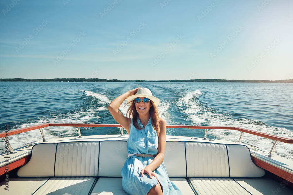 Relax, travel or happy woman on boat on ocean for outdoor vacation or holiday on summer adventure. Cruise, tourist and person with smile, fashion or hat on yacht on sea for weekend trip in Greece