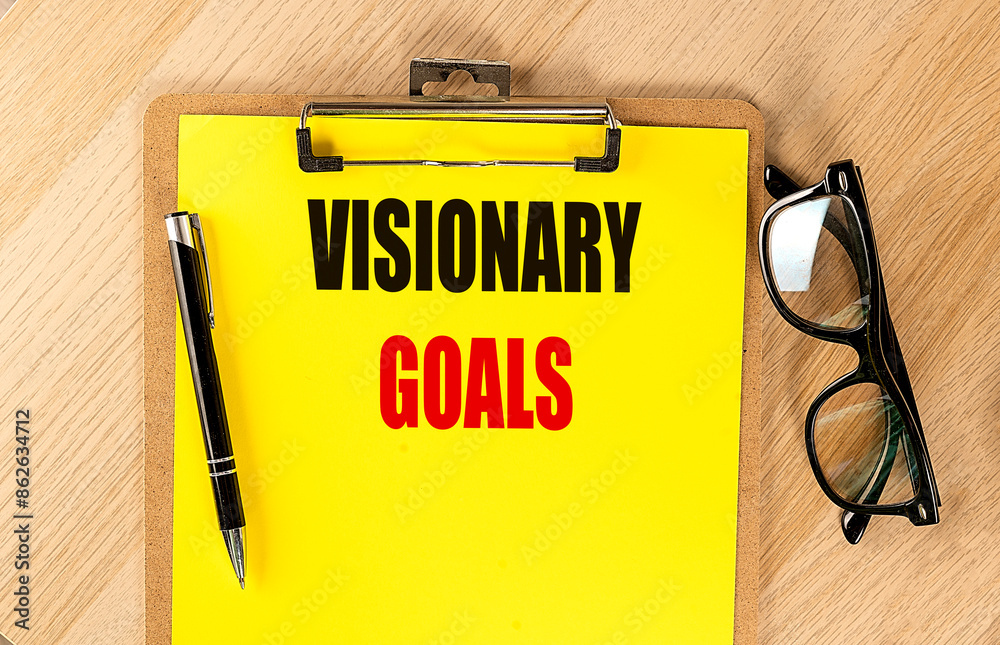 VISIONARY GOALS text on yellow paper on clipboard with pen and glasses
