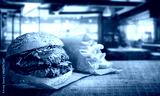 Delicious burger on the background of the interior of the burger shop. Fresh hamburger with salad, meat, cheese and sauce on the table. Fast food.