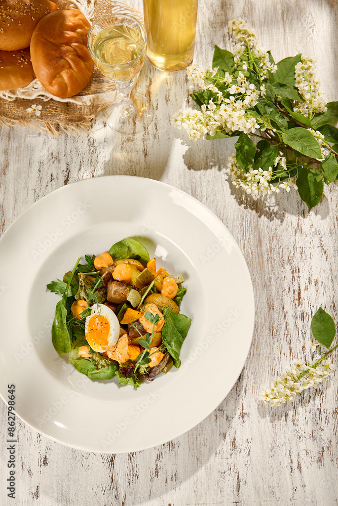 Vibrant Roast Vegetable Salad with Boiled Egg in Natural Sunlight on Rustic Wooden Background