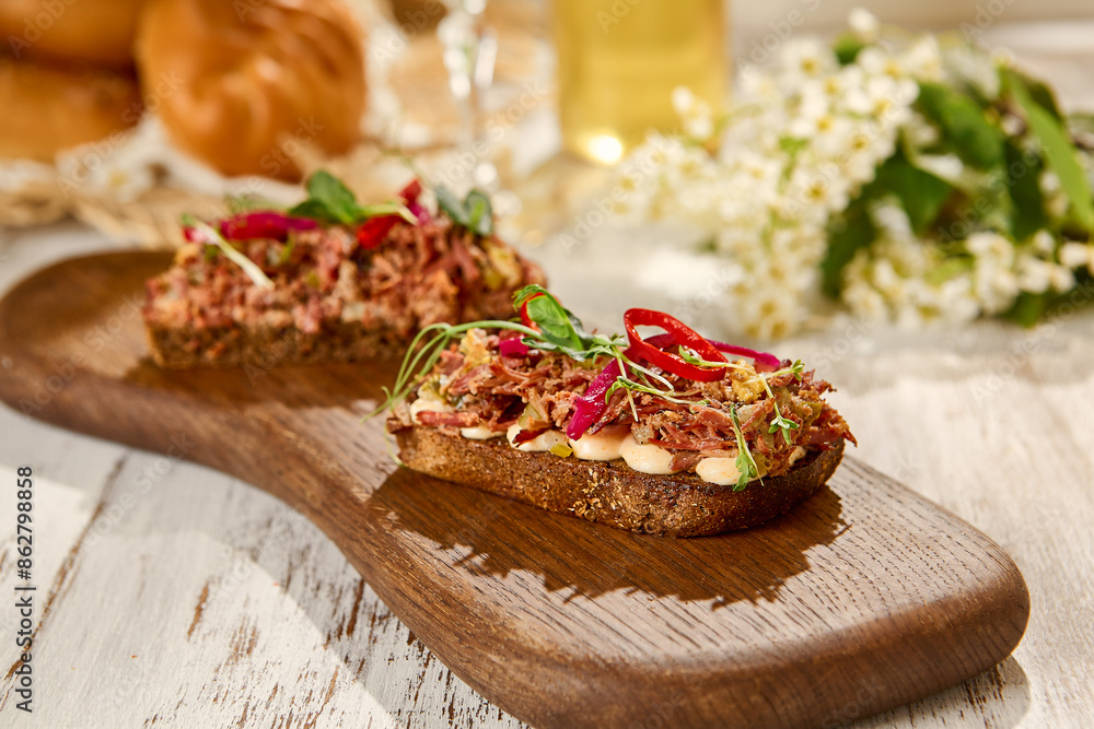 Rustic Pulled Beef Bruschetta on Wooden Board in Sunlit Setting