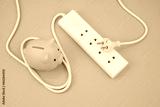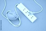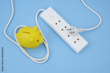Electric sockets, plug and piggy bank on blue background. Save money and electric energy consumption concept.