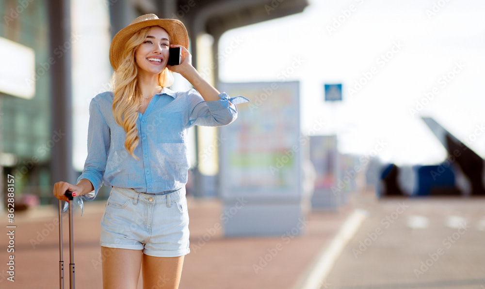I Arrived. Young woman traveller wearing sun hat, talking on mobile phone after flight arrival in airport, free space