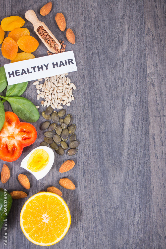 Fresh healthy eating as source various vitamins or minerals. Hair in good condition. Place for inscription on board