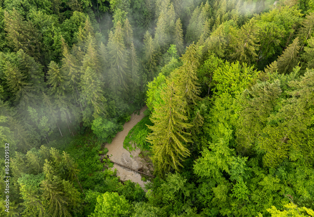 Aerial view of river through a forest with a lot of water after heavy rainfall.