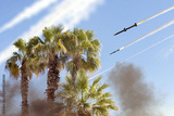 Ballistic missiles in the sky on the background of palm trees , traces of missile launch. Concept: war between Iran and Israel, missile attack.
