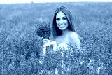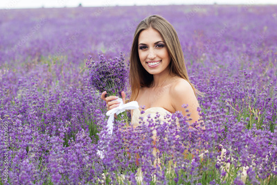Portrait of bride girl with bouquet at lavender field