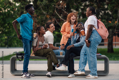 Cheerful diverse group of college students talking and smiling at campus