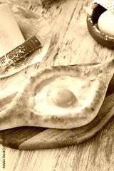 Freshly Baked Khachapuri Adjaruli with Egg and Cheese on Wooden Table, Gourmet Georgian Cuisine in Sunlit Rustic Kitchen