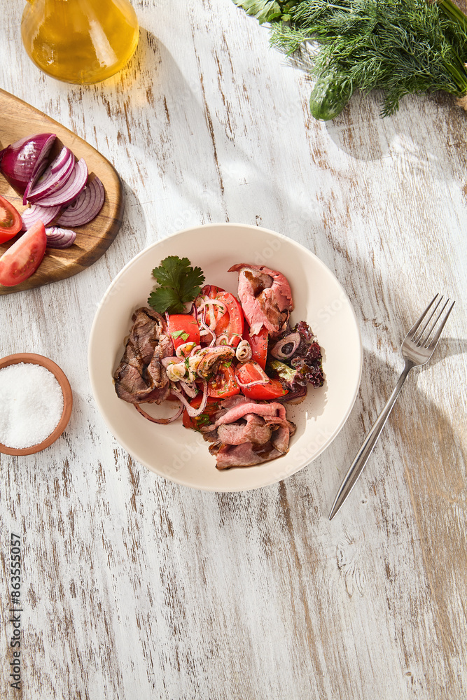 Top View of a Healthy Roast Beef and Tomato Salad Served on a Wooden Table, Bright Daylight Setting