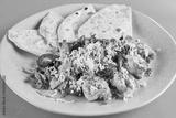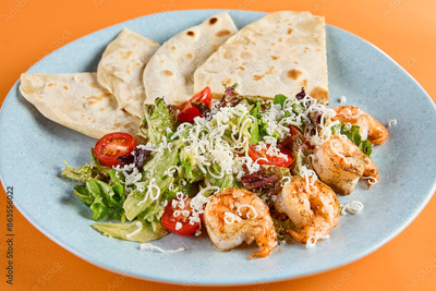Shrimp Caesar Salad with Parmesan and Tortilla Slices on Light Blue Plate