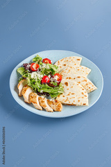 Delicious Chicken Caesar Salad with Fresh Tortilla Slices on Blue Background.