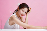 ピンク背景で撮影をした若い女性の軽やかなビューティー ポートレート