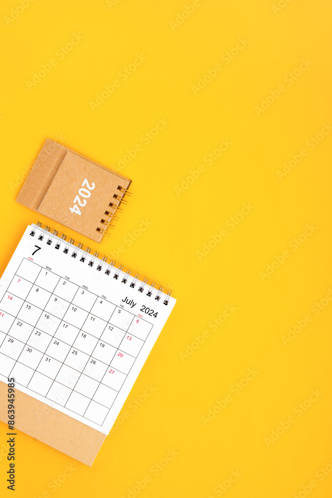 2024 July Desk Calendar On Yellow Background, Position with copy space On Yellow Background.