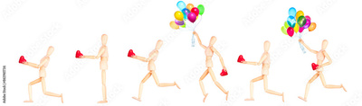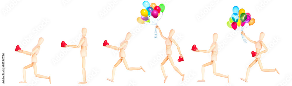 Assortment of wooden mannequins in different stances, isolated on white backdrop