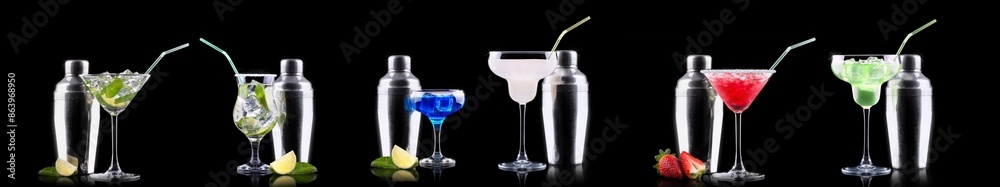 Different alcohol cocktails like beer, martini, soda, champagne, whiskey