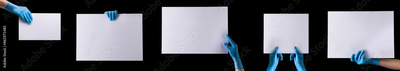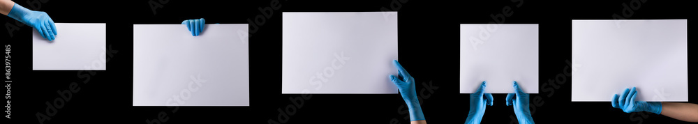Doctor's hand in sterile medical gloves holding banner isolated on black