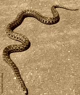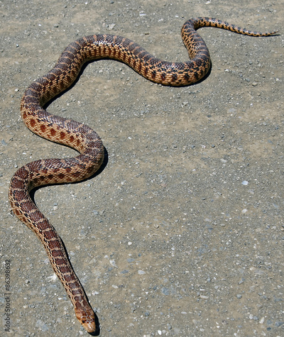 Pacific Gopher Snake (Pituophis catenifer) crawling on trail. Santa Clara County, California, USA.